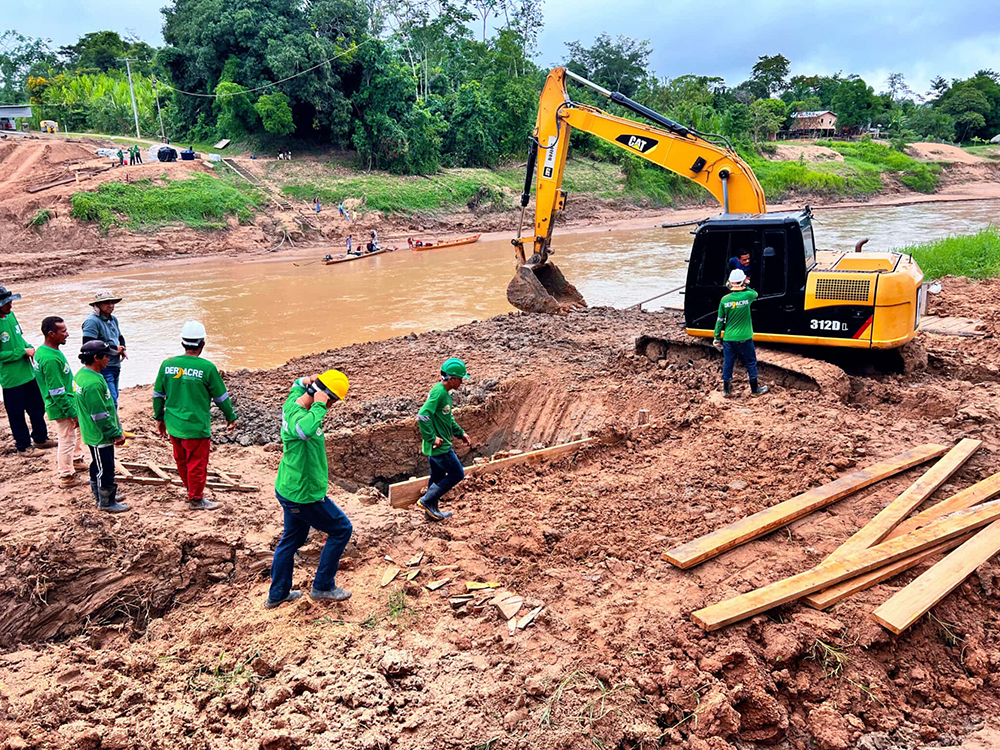 Equipe do Deracre avança na escavação dos blocos de fundação da passarela sobre o Rio Amônia, em Marechal Thaumaturgo 17 de junho de 2025