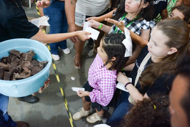 Estátua de chocolate do Mapinguari é quebrada e chocolate é distribuído ao público no encerramento da Expoacre 4 de agosto de 2025