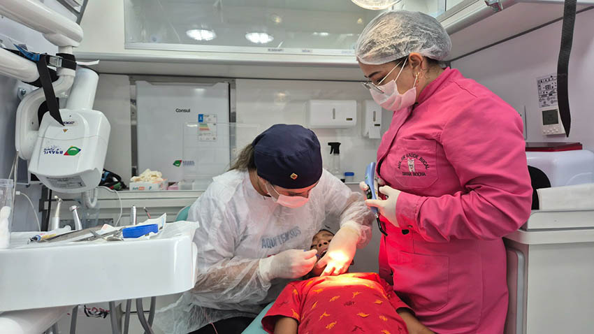 Os atendimentos odontológicos estão sendo realizados diretamente na balsa, com total segurança e infraestrutura. Já nas escolas das comunidades, equipes realizam atendimentos médicos, de enfermagem e nutricionais, além da entrega de kits de saúde bucal contendo escova, creme dental e fio dental.
