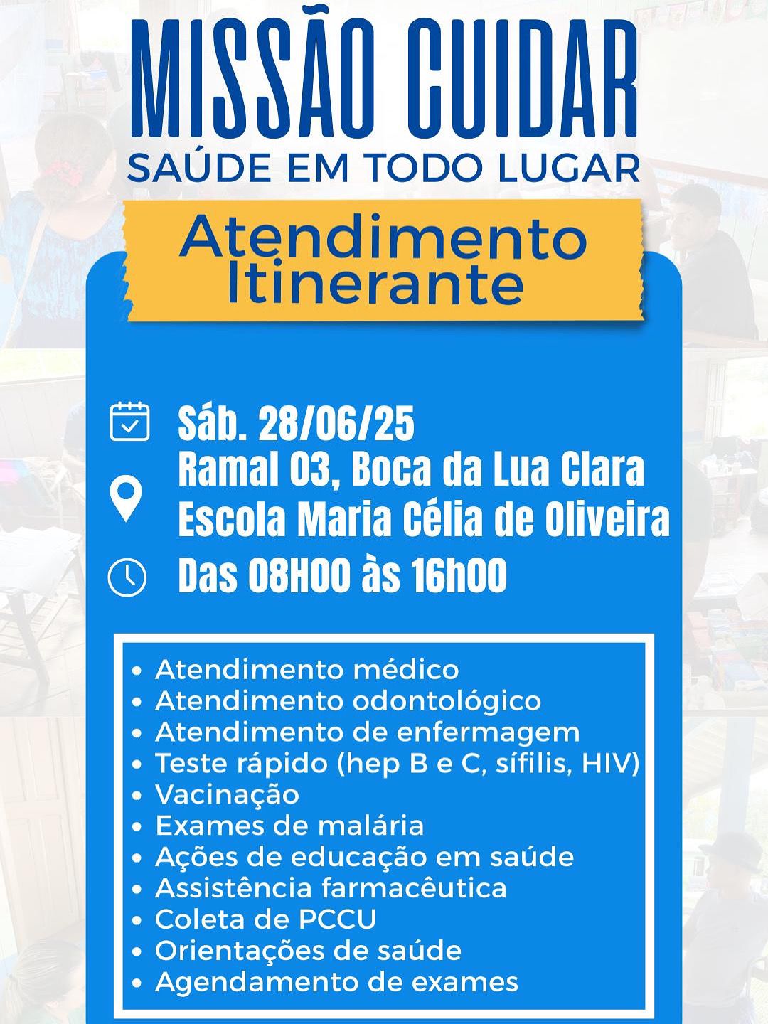 A Prefeitura de Cruzeiro do Sul, por meio da Secretaria de Saúde, vai realizar um atendimento itinerante neste sábado, 28, na Escola Maria Célia de Oliveira, na Comunidade Boca da Lua Clara, ramal 3, das 8h às 16h.